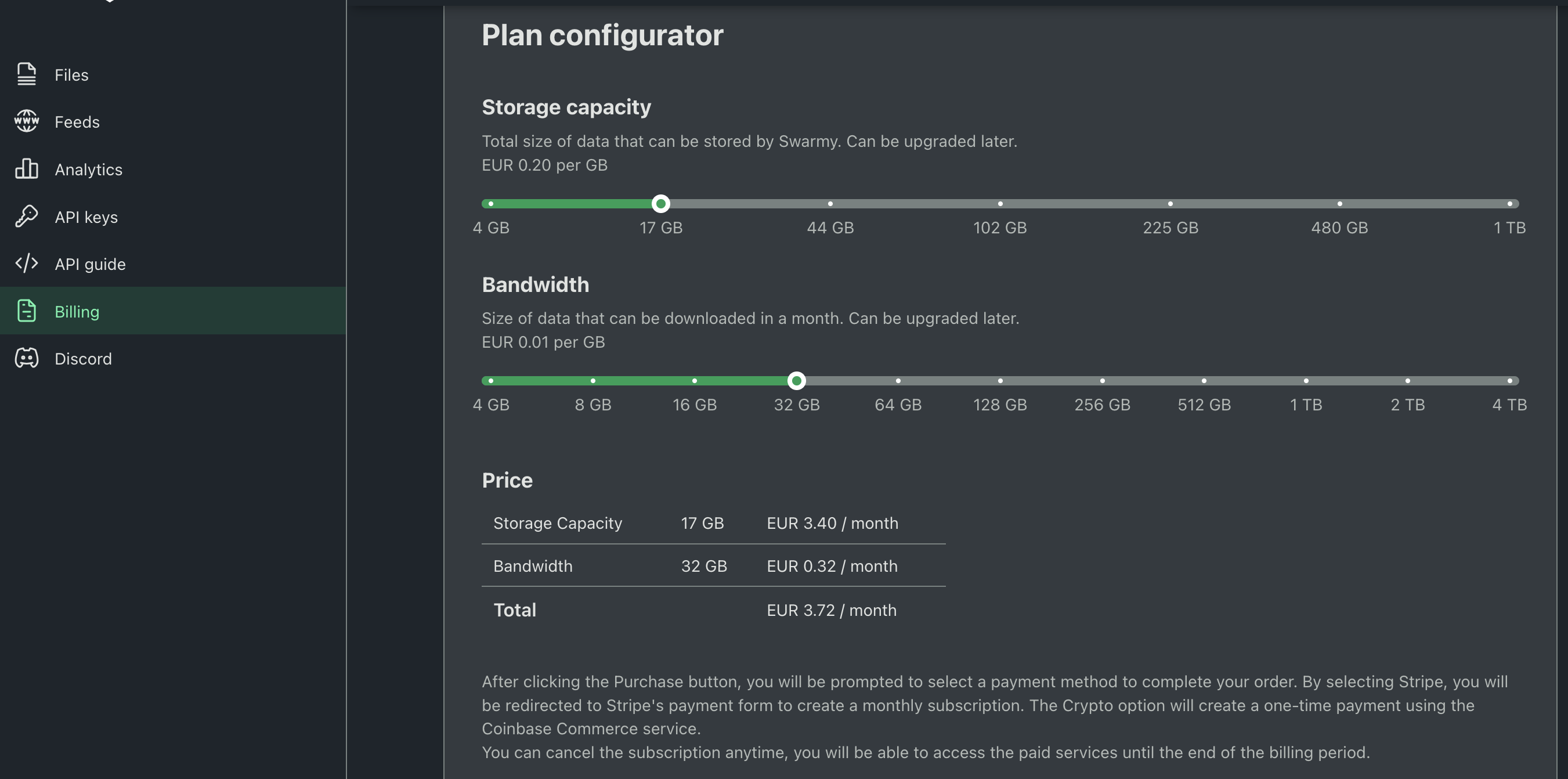 To use Swarmy, you need to create an account on Swarmy. Afterwards, you should request a storage quota on the "Billing" page.